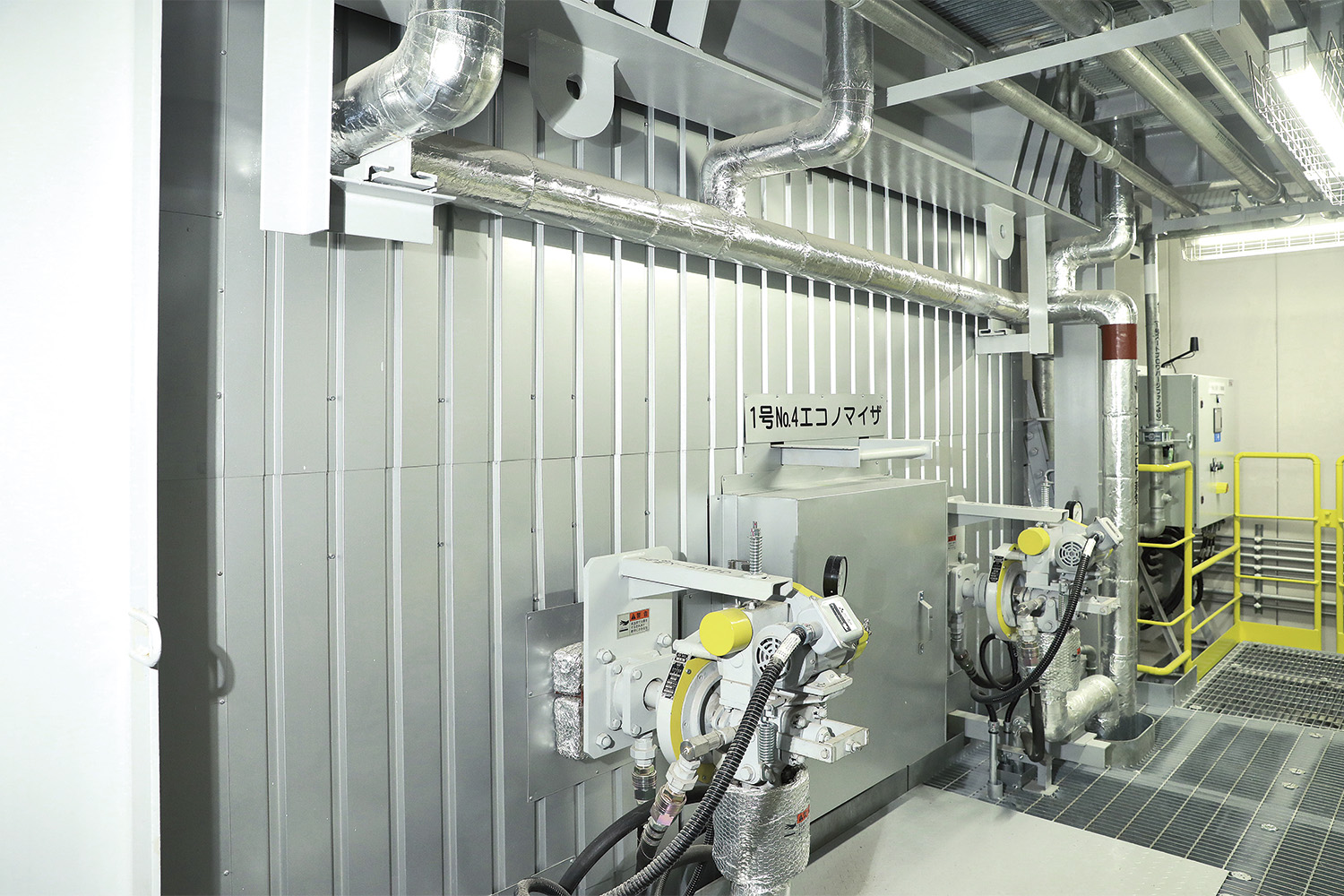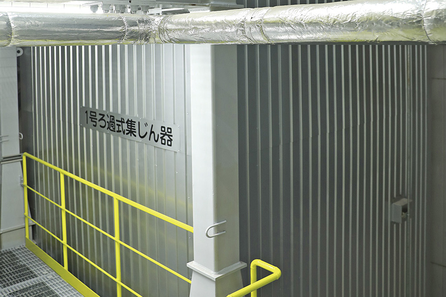 有害物質を取り除いた後の排ガスは、誘引送風機により煙突から大気に放出されます。
