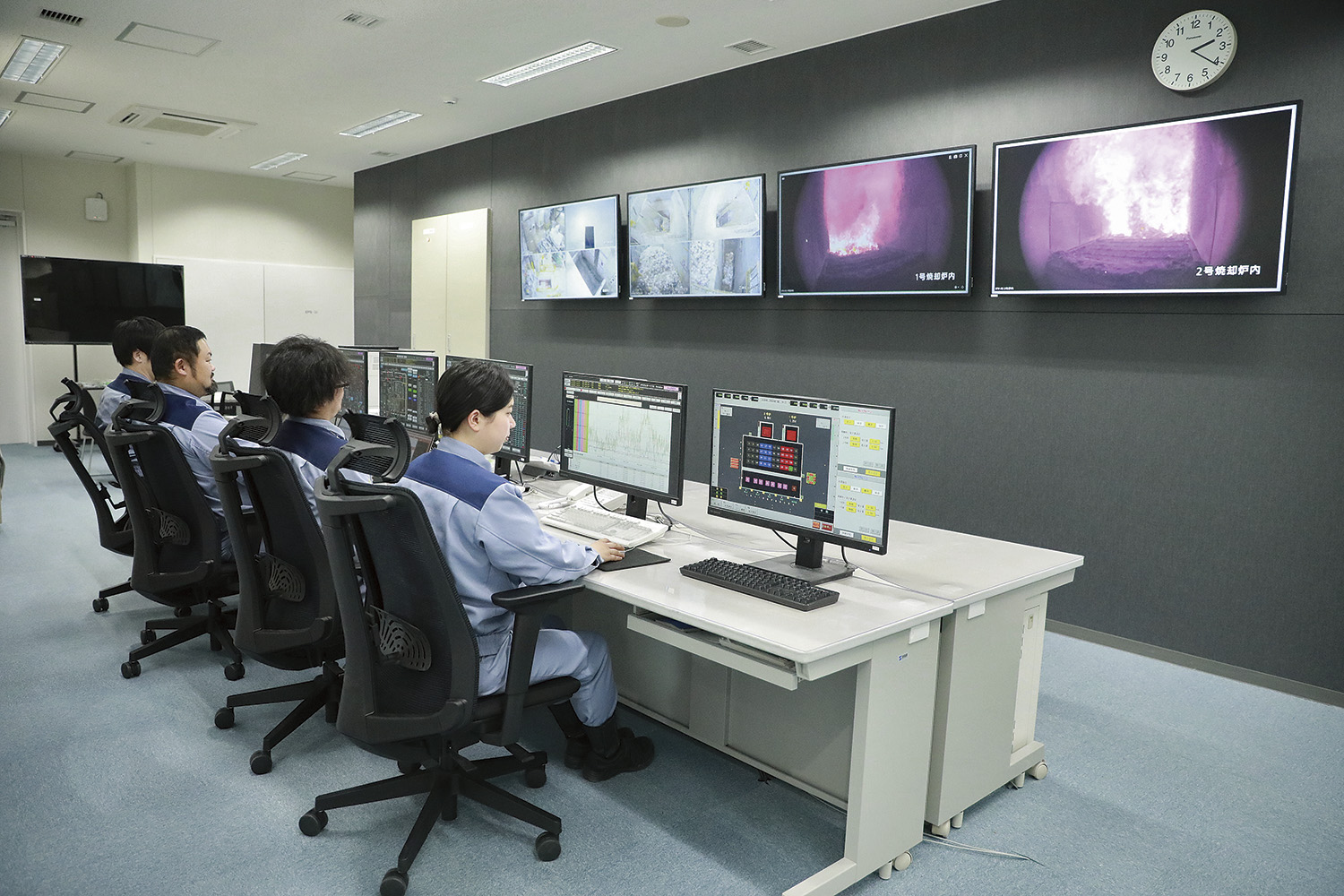 焼却炉の燃焼状況、蒸気タービン発電機の発電出力、排ガスの公害監視など、焼却施設内すべての設備の監視、制御を行っています。