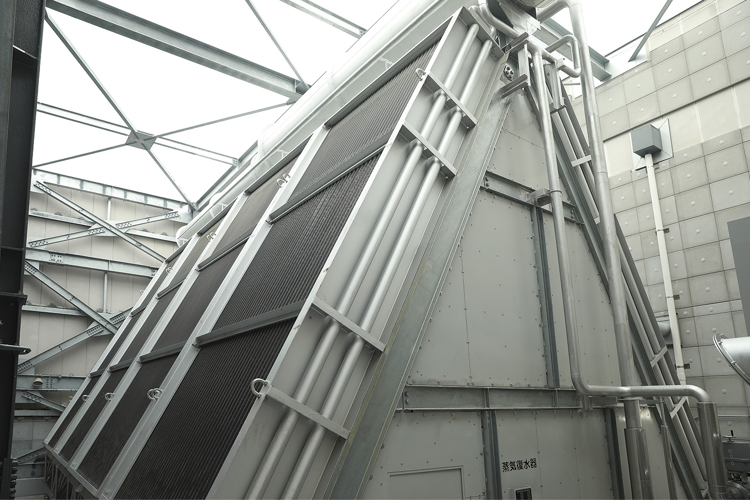 蒸気タービンで発電に利用した後の蒸気を冷却して水に戻します。戻した水はボイラに送られ、再び蒸気になります。