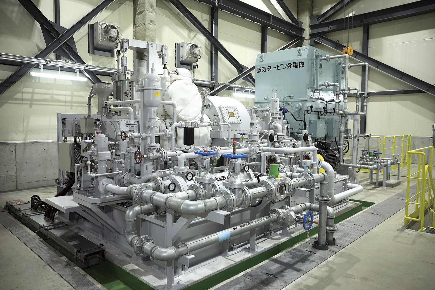 ボイラで発生した高温・高圧の蒸気を利用して、タービンを回し、最大3,200kWの発電を行います。発電する電気は、一般家庭約7,000軒分の使用量に相当します。